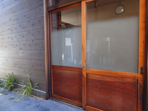 宿のアルミの玄関扉が突風であおられガラスが割れて破壊されてしまいました。近所の建具屋さんもお手上げ・・・。修理不能ということで困っていたところ、物置の隅に眠る写真の引き戸を再利用できないか?これまた近所の大工さんに相談したところ、めでたく…